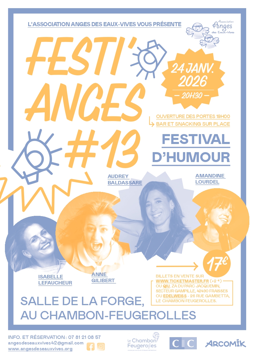 Festival d'Humour - L’association Anges des eaux-vives est heureuse de vous inviter à la 13e édition du Festi'Anges, un moment de rire, de partage et de solidarité au profit des enfants en situation de handicap - Samedi 24 janvier 2026 - 20h30 - Ouverture des portes : 19h00 pour profiter du bar et du snacking avant le spectacle - Salle de la Forge au Chambon-Feugerolles