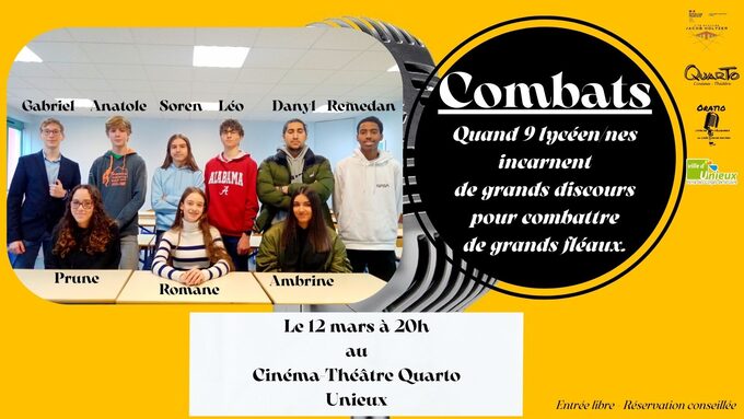 Après quelques séances de travail sur la voix, la posture, la rhétorique, les élèves ont découvert et se sont saisis de grands discours en lien avec de grandes causes à défendre ; l’idée était de montrer la permanence de ces combats. Ainsi, les discours s’organisent autour de 4 thématiques (la lutte contre la pauvreté, la lutte contre le sexisme, la lutte contre la destruction de l’environnement, la lutte contre les discriminations raciales) ; chaque thématique est illustrée par deux discours qui se répondent afin de mettre en évidence la permanence et l’universalité du combat.