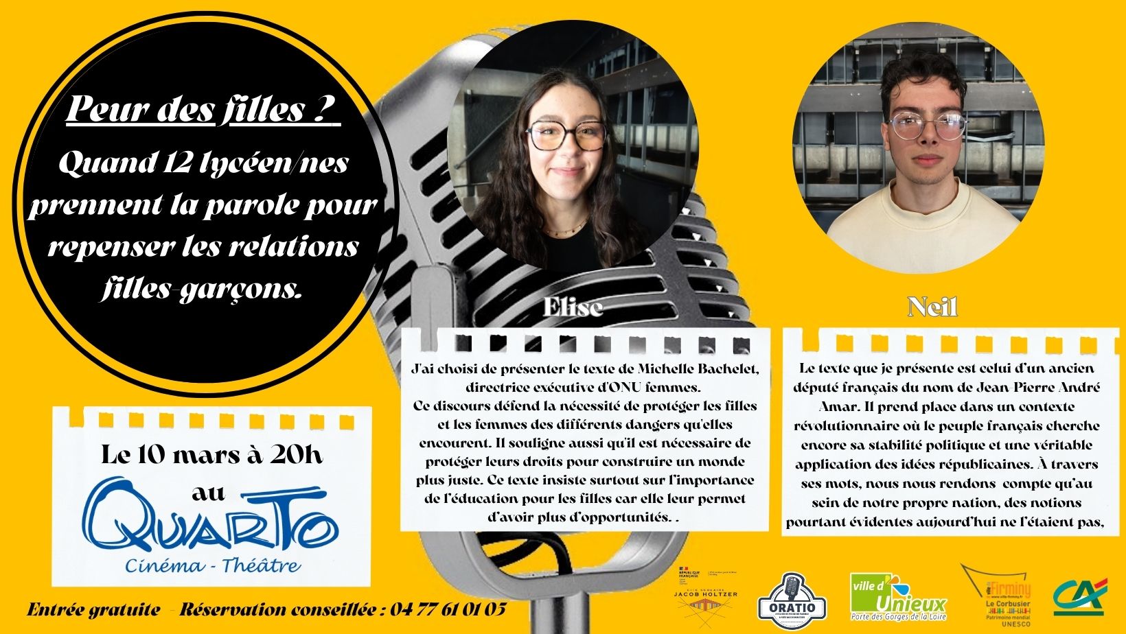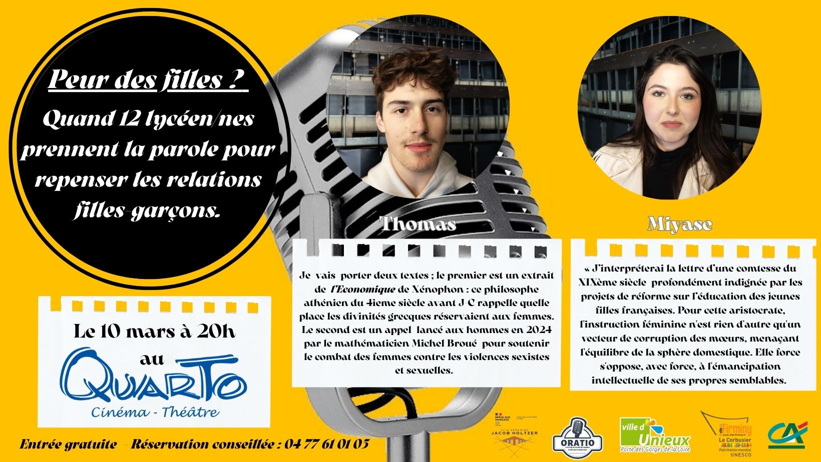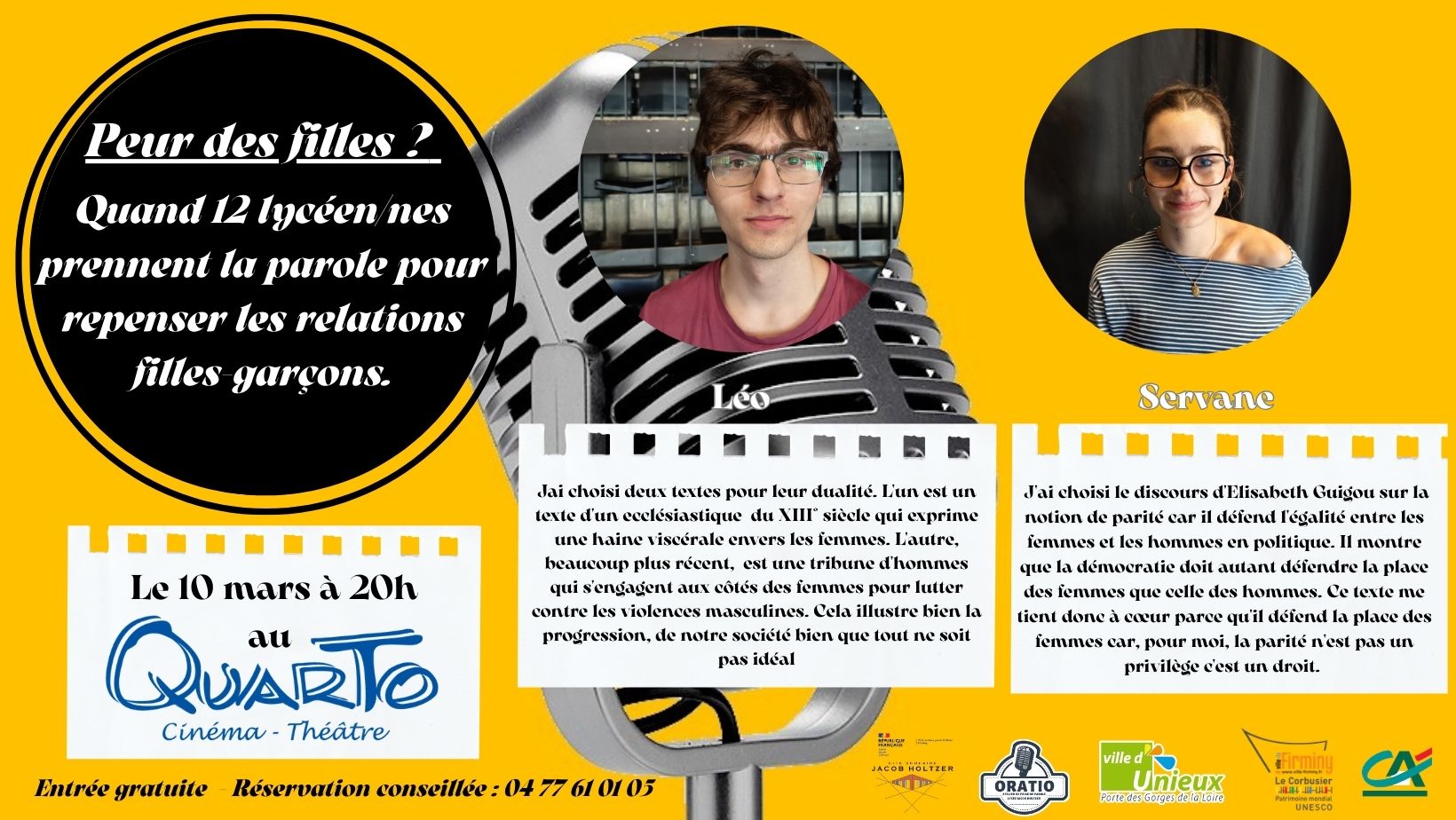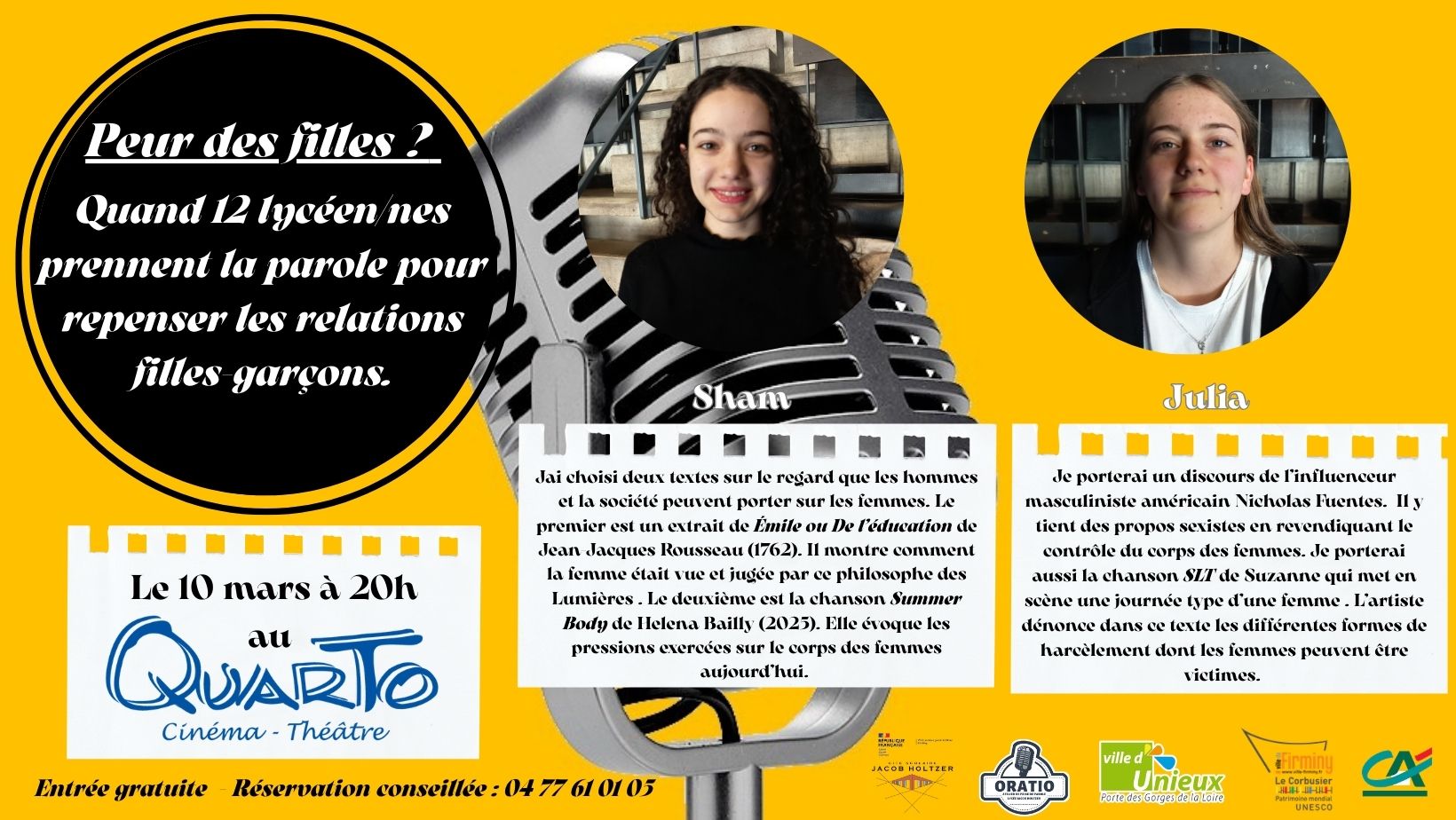 Oratio, l’atelier de prise de parole du lycée Jacob Holtzer, présentera « Peur des filles ? » le 10 mars 2026 à 20h au cinéma-théâtre Quarto à Unieux (ouverture des portes à 19h30 - Entrée gratuite).